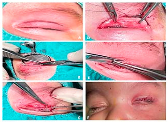 Main surgery steps. (A) Marking the incision 5 mm above the free eyelid edge; (B) The excision of the fibrous band on the entire length and width of the tarsal plate; (C,D) Application of sutures on the trajectory: skin (ciliary margin)—upper tarsal plate—skin (ciliary margin) in the inner, median and outer third of the upper eyelid; (E) Excision of a hypertrophied orbicular pretarsal muscle extension; (F) Cutaneous suture (personal collection).