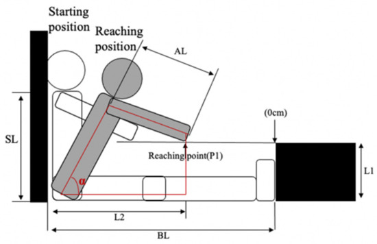 where L1 represents the height of box (i.e., 26.5 cm); SL represents the sitting height; AL represents the arm length; BL represents the base length (i.e., the length between the wall and the feet against the box); P1 represents the reaching point.