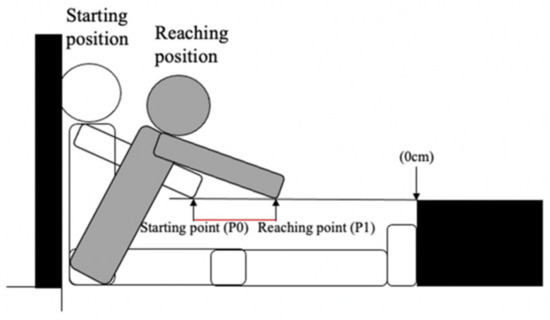 The MSR test was administered using a specially constructed box with a slide ruler attached to the top. The height of the box was 26.5 cm. Before testing, the participant was seated on the box with head, back and hips against a wall (90° at hip joint), both legs together and fully extended, and the feet placed flat against the box. The participant then extended arms forward, placing the hand on the ruler with palms down (i.e., the starting point (P0)). Anthropometric characteristics were collected, including sitting height, arm length and base length in a starting position (Figure 1). Sitting height (SH) was vertically measured from acromion to the floor with head, back and hips against the wall. Arm length (AL) was measured from acromion to the middle fingertip with arm fully extended. Base length (BL), the approximate leg length, was measured parallel to the floor from the wall to the box with legs fully extended and feet placed against the box (90° at ankle joint). Then, the participant was asked to slowly reach forward as far away as possible, keeping the hips in contact with the wall, sliding the hands across the top of the ruler (i.e., the reaching point (P1)). Each participant performed the MSR test twice, and was allowed to rest 1–2 min between trials. All tests were administered by the same researcher. Test was repeated if the participant did not complete standard testing procedures (i.e., without legs fully extended or without hips in contact with the wall).