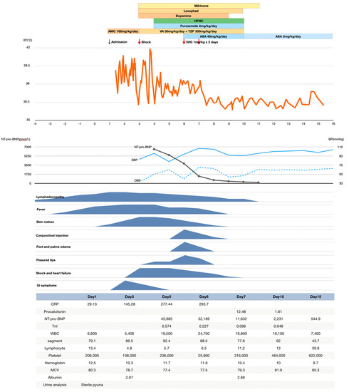 - Kanegaye, J.T.; Wilder, M.S.; Molkara, D.; Frazer, J.R.; Pancheri, J.; Tremoulet, A.H.; Watson, V.E.; Best, B.M.; Burns, J.C. Recognition of a Kawasaki disease shock syndrome. Pediatrics 2009, 123, e783–e789. [Google Scholar] [CrossRef] [PubMed] [Green Version]