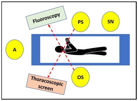 Position of the surgical team (scheme): the pediatric surgeon stands in front of the patient, with the thoracoscopic screen on the opposite side or at the bottom of the table, while the orthopedic surgeon stands on the back of the patient (in front of the spine) looking at the monitor of C-arm fluoroscopy. The scrub nurse stands on the left of the pediatric surgeon. (A = anesthetist, PS = pediatric surgeon, OS = orthopedic surgeon, SN = scrub nurse).