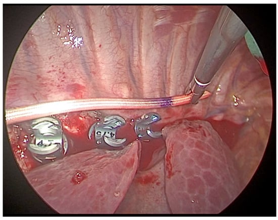 The intercostal vessels are identified and carefully dissected with bipolar forceps. Dissection and coagulation of the vessels below the pleura is helped through the mini-thoracotomy access with a pad mounted on Kelly instrument. This maneuver helps to keep the field clean and, in case of possible bleeding, to be faster in hemostasis.