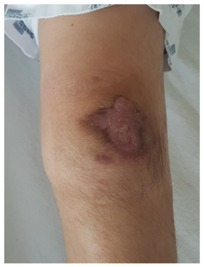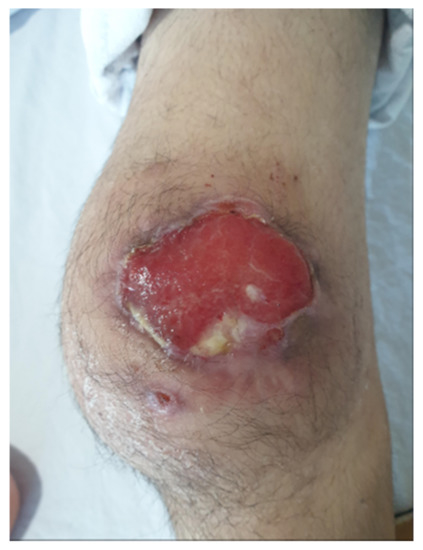 Skin breakage with concurrent serous discharge appeared in the prepatellar area 4 weeks after the onset of initial symptom.