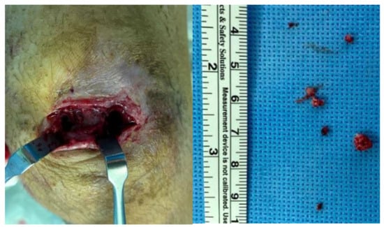 - Evans, D.K. Osteomyelitis of the patella. J. Bone Jt. Surg. 1962, 44, 319–323. [Google Scholar] [CrossRef]