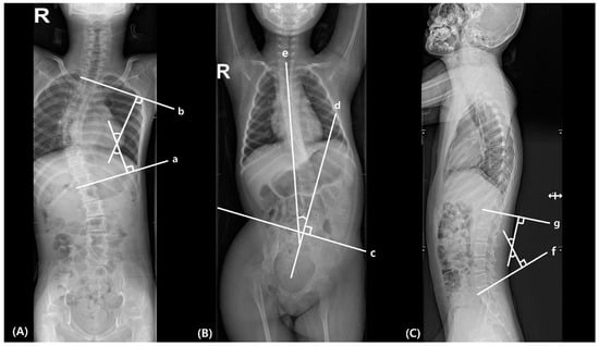 Measurement of (A) scoliosis, (B) pelvic obliquity and (C) lumbar lordosis. (a) The inferior endplate of the lowermost vertebral body in scoliosis curvature; (b) the superior end plate of the uppermost vertebral body in scoliosis curvature; (c) line connecting the bilateral iliac crests; (d) perpendicular line to the line connecting the bilateral iliac crests; (e) line between the center of T1 to S1 vertebral bodies; (f) S1 superior endplate line; (g) T12 inferior endplate line.
