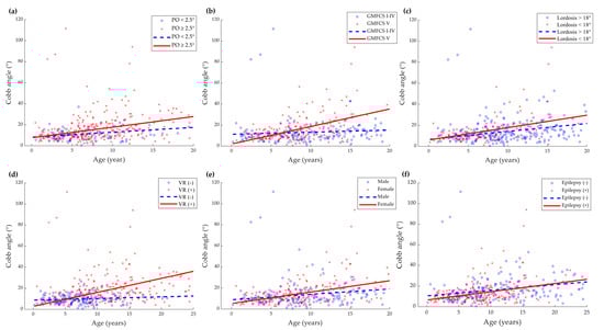 Subject-specific (scatterplot) and predicted progression line of Cobb angle (°) versus age (years) according to clinical parameters: (a) pelvic obliquity (PO); (b) gross motor function classification system (GMFCS); (c) lumbar lordosis; (d) vertebral rotation (VR); (e) sex; (f) epilepsy. There was a significant increase in the progression rate of scoliosis in patients with PO ≥ 2.5°, GMFCS level V, vertebral rotation (Nash–Moe grade ≥ 1), and in female patients. Reduced lumbar lordosis (<18°) in ≥2 years of age and the presence of epilepsy did not significantly affect scoliosis progression.