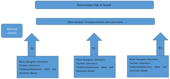 Directly after the start of the class year 2019/2020, parents and children/adolescents were informed by teachers about the goal and the procedure of the intervention and the study. The intervention “Safe & sound” was offered to all children/adolescents in the participating classes. Children/adolescents of one class participate together in a session one hour each week within a fixed schedule. If children/adolescents were considered for the individual sessions, parents were informed and asked for their approval. Individual sessions were indicated when teachers report psychological (anger, stress, anxiety, sadness) or physical (sleeplessness, pain) problems. Children/adolescents received questionnaires at T0, T1, and T2. Furthermore, music therapists and teachers were interviewed at T0, T1, and T2. After every music therapy session (both classroom sessions and individual sessions), music-therapists completed a questionnaire on treatment integrity (see Figure 1).