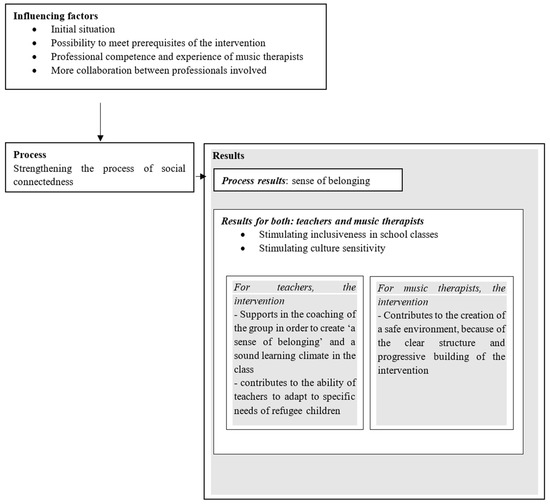 Teachers mentioned that the interventions support supervision in order to create a “sense of belonging” and a sound learning climate in the classroom (see also Figure 1). One quote of a teacher illustrates this: “Now that I have seen how he (music therapist) has tackled that and how the children react to that, I think yes, that is a completely different approach than from a school perspective”. Teachers also reported that the intervention contributes to the adaptation to specific needs of refugee children/adolescents: “I also like to include the findings of the music therapist if you want to map the behavior of a child. To take him there as an outsider with a different view on the starting point and to ask for advice”.