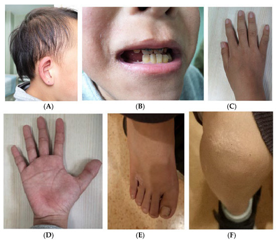 Physical examinations show a height of 132.0 cm (−2.0 SDS) and a weight of 30.1 kg. His BMI was 17.2 kg/m2, and he was at Tanner Stage II (G2, PH1) for pubic hair and testicle volume at the age of 11. Prominent craniofacial features and ectodermal dysplasia are noted, including relatively sparse scalp hair, a high forehead hairline, laterally thinned eyebrows, broad nasal cartilage, a bulbous tip of the nose, a long and flat philtrum, a thin upper lip vermilion, a high palate, retromicrognathia, downslanting palpebral fissures, and large laterally protruding ears (Figure 1A). Oral examination presents delayed dentition and irregular tooth alignment in his permanent teeth (Figure 1B). The examination of both hands shows very mild, short, and wide middle fingers, and the second to fourth fingers of both hands are mildly tumid (Figure 1C,D). Features of his feet include a short and thick big toe deformity, ten wide, short, and thin toenails, and being flat-footed (Figure 1E). His skin presents xanthomas on his knee and ankle joints (Figure 1F). In the bone, muscle, or joint, there is physiological bending of the backbone and no tenderness or vertically percussed pain. The rest of the systemic examination, including the cardiac, respiratory, abdominal, and nervous systems, is normal.