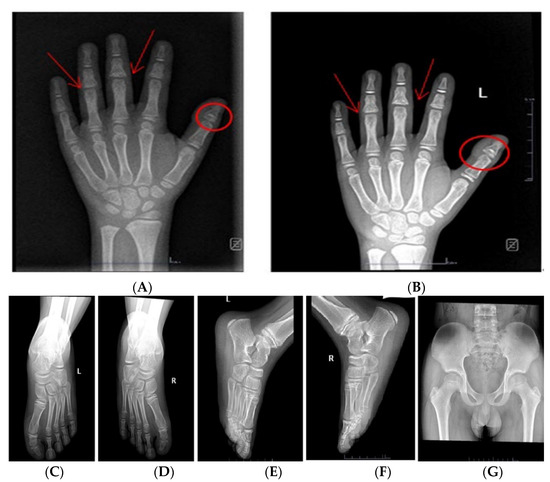 X-ray report of the child: Frontal radiographic findings of the left hands of the child: (A): The photograph of the hands shows brachydactylia with shortening of the middle phalanges of all fingers. The coned epiphyses of the first proximal phalanges (circles) and more subtle, partially fused coned epiphyses of the third to fourth middle phalanges (arrows) can be noticed. Bone age (9 years) was delayed compared to chronological age (11 years). (B): The radiograph of the left hand notes a chronological age of 11 years and 6 months. (C,D): Anteroposterior radiograph of the foot; (E,F): Lateral radiograph of the foot: Foot X-ray for him demonstrates that the 1st, 3rd, and 5th proximal phalanges of both feet were conical epiphyses. (G): Plain radiographs of the anteroposterior view of the pelvis: no obvious abnormal X-ray signs in the pelvis.