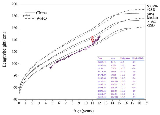 An 11-year-old boy was referred to the endocrinology service for the evaluation of his short stature and extremely slow growth velocity. He was the first child of non-consanguineous Chinese parents. The child was born prematurely at 36 weeks of gestation by cesarean with a birth weight of 2.4 kg, −1.15 standard deviation scores (SDS), and a birth length of 48 cm, −1.3 SDS. The birth head circumference parameters were not available, but they were described as normal. No milestones in motor skills and language retardation were reported. However, the low growth velocity and the retardation of bone age were noted after birth. His height was 93.3 cm (−4.0 SDS) at the age of 4.9 years old, according to the height growth curves for children and adolescents in China [14,15]. We used two different methods: arginine and clonidine, for the GH stimulation test, and the peak was 18.17 ng/mL and 15.10 ng/mL, respectively, with normal IGF-1 at the age of 5 years old. Although the Wechsler Intelligence Test was performed at the age of 10 years old and was normal with an IQ of 112, his parents noted that he is better at math and has an average grade in Chinese. The family history is negative for short stature. The height of his father was 172 cm, and the height of his father mother was 160 cm. The family history revealed that his parents and younger sister were all healthy.