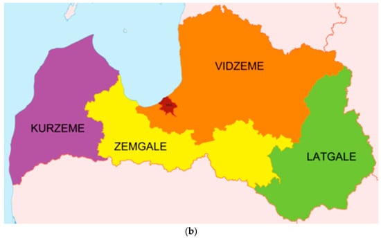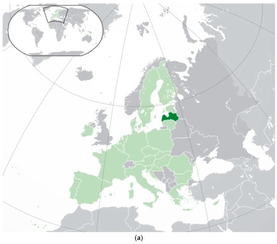 Maps: (a) Location of Latvia (dark green) by Nuclear Vacuum—This W3C-unspecified vector image was created with Inkscape, CC BY-SA 3.0, https://commons.wikimedia.org/w/index.php?curid=8105197 (accessed on 16 August 2022); (b) Regions of Latvia by Central Statistical Bureau of Latvia—Central Statistical Bureau of Latvia, CC BY-SA 3.0, https://commons.wikimedia.org/w/index.php?curid=18527500 (accessed on 16 August 2022).