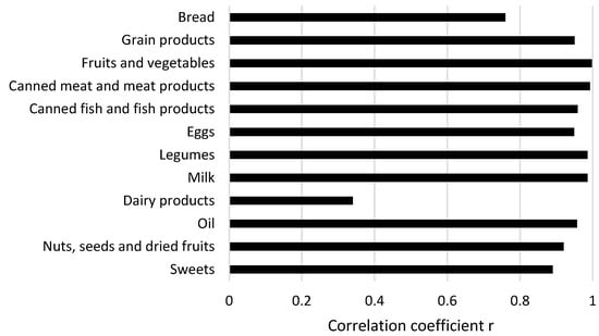 A strong correlation was observed for the following food groups: grain products, fruits and vegetables, canned meat and meat products, canned fish and fish products, eggs, legumes, milk, oil, nuts, seeds and dried fruits, sweets, which means that the presence of these products in food packs contributed to parental satisfaction ensuring a positive assessment of the food packs. A moderately strong correlation was shown for bread, while a weak correlation was found for dairy products.