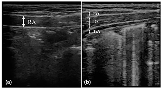 Measurement of abdominal muscle thickness through ultrasonography. The thickness of the rectus abdominal muscle (RA) was measured by placing the probe vertically (a), and the thicknesses of the external oblique (EO), internal oblique (IO), and transversus abdominis (TrA) were measured by placing the probe horizontally (b), and before and after the intervention.