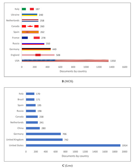 Figure 2A–C shows the top 10 producing countries for knowledge related to psycholinguistics. As can be seen, the top 10 countries all belong to the Western world except for Russia, which appears in three databases, along with China and Brazil in Lens. Even though these countries dominate the production of psycholinguistics research, contributions extend beyond this list to the countries after the top 10.