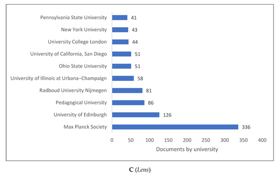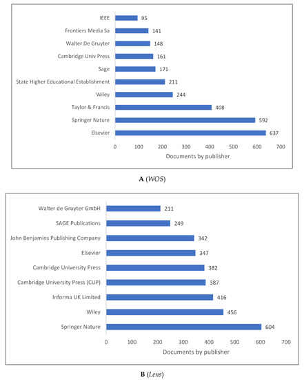 Figure 5A,B shows the list of top 10 publishers for knowledge in psycholinguistics. As Scopus does not include publisher information, these lists are limited to WOS and Lens databases. In terms of publishing research related to psycholinguistics, Springer Nature and Elsevier achieve the top two rankings in both databases.