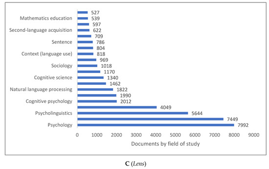 In psycholinguistics, psychology and language are integrated, but they also integrate with other fields (Figure 6A–C). Psycholinguistics is dominated by publications in psychology, arts and humanities, social sciences, and neuroscience, as shown in Figure 6A. According to Figure 6B, linguistics, psychology, neurosciences, and neurology constitute the top four research areas in psycholinguistics. Several of these findings are confirmed in Figure 6C, where psychology, linguistics, psycholinguistics, and computer science are introduced as the four top fields of study in psycholinguistics. Lens shows more specific fields associated with this field of study (e.g., language acquisition, language use, perception, and comprehension).