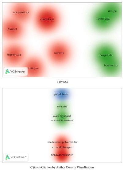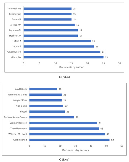 It should never be confined to only top authors in the field to contribute to psycholinguistics because any paper published in the field is a contribution. Our goal was to display authors that produced more psycholinguistic knowledge as shown in (Figure 7A–C). Although the ranking differs according to the database, most of the authors are the same across the three databases. Gibbs [56], who is ranked first in Scopus and WOS, is ranked ninth in Lens. It could be due to Lens’ comprehensiveness to include more data compared to Scopus’ and WOS’ limitation to indexed journals and documents.
