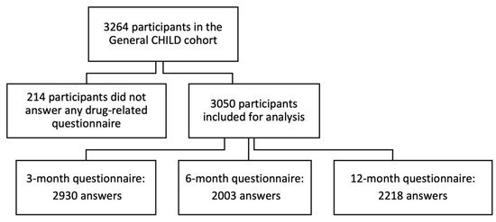 From 3264 pregnant women recruited in the General CHILD cohort (Figure 1), 3050 families (93%) answered at least 1 drug-related questionnaire. The 3-month questionnaire had the highest response rate (90%), whereas the 6-month questionnaire had the lowest (61%). Table 1 summarizes the participants’ characteristics which were geographically well distributed between the study centers.
