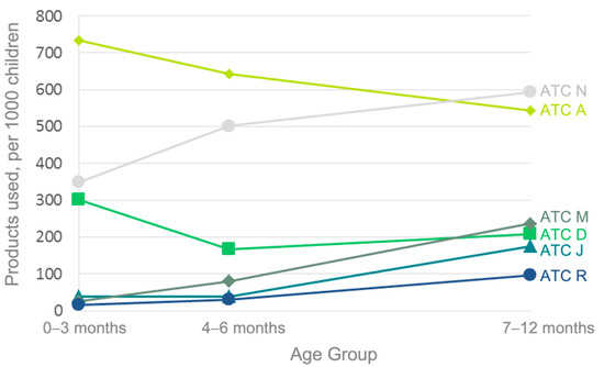 Exposure to category ATC A (Alimentary tract and metabolism) pharmaceuticals was the most common among the study population (962 products/1000 children; primarily Vitamin D), followed by categories ATC N (Nervous system, 688/1000 children; primarily acetaminophen) and ATC D (Dermatologicals; 501/1000 children).