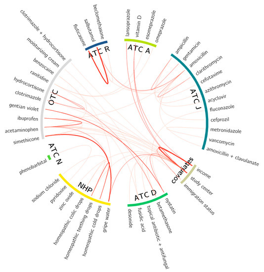 Descriptive statistics were used to depict use of pharmaceutical products in different age periods (0–3, 4–6, 7–12 months). A non-parametric Kruskal–Wallis test for differences was performed and followed up by post hoc testing using Dunn’s method. Mutual information (MI) scores were calculated between all pairs of binary variables indicating usage of a specific prescription medication, over-the-counter drug (OTC) or natural health product (NHP) during the first year of life and compared using a complementary Spearman rank correlation approach. MI scores ≥ 0.005 underwent permutation testing (1000 permutations) to assign p-values (significance at p ≤ 0.05) which were corrected for multiple testing using the Benjamini-Hochberg method. Prescription drugs, OTCs and NHPs associated were grouped into top-level ATC codes, OTC and NHP categories, respectively, and the MI scores were visualized as lines connecting all significant pairs of variables on a chord diagram (or globe) constructed using Circos [15].