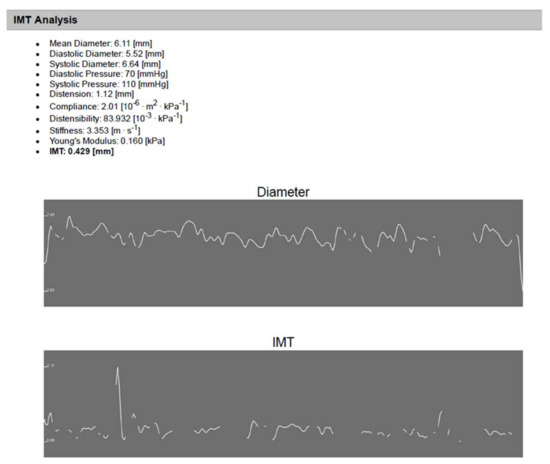 An illustrative example of IMT analysis using (Carotid Studio) software for an 11 year old child on old ASMs for 7 years. The analysis shows automatic measurement of CCA diameter and IMT as well as automatic calculated arterial stiffness.
