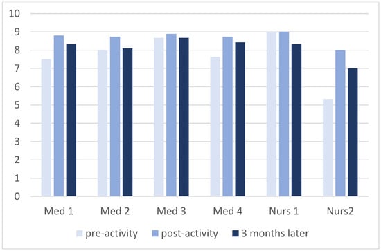To evaluate this as a learning system, a sepsis test was performed based on international guidelines for the management of severe sepsis and septic shock [39], both pre-escape room and after this activity. Furthermore, it was repeated 3 months later in order to assess the degree of knowledge acquired and retained over time. The results show an improvement in the score after carrying out the activity that persists over time, to a somewhat lesser degree. However, the initial result was already very high, suggesting that the test used was easy for all participants. It would be interesting to periodically repeat the session in order to consolidate the learning.