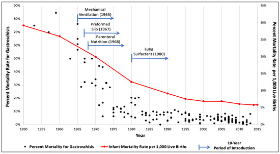 Georgeades, C.; Mowrer, A.; Ortega, G.; Abdullah, F.; Salazar, J.H. Improved Mortality of Patients with Gastroschisis: A Historical Literature Review of Advances in Surgery and Critical Care from 1960–2020. Children 2022, 9, 1504. https://doi.org/10.3390/children9101504