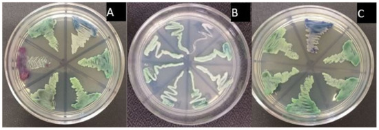 Yeasts were reinoculated in BBL CHROMagar Candida Medium (Becton Dickinson and Company, NJ, USA) and incubated for 24–48 h at 37 °C. The yeasts were identified on the basis of the color of the colonies (C. albicans—light green to medium; C. krusei—pale pink, purple (harsh with extended edges, pale); C. tropicalis—dark blue to grayish blue, with a dark halo in agar; C. glabrata—varies from white, pink or purple; C. parapsilosis—white to pale pink) [9,10]