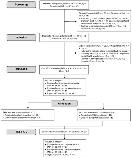 Flowchart of study participants. Note: missing data were mostly based on technical difficulties, that is, no video/audio recording. n1 = Center 1, n2 = Center 2; CBT = cognitive behavior therapy; HC = healthy control; SAD = social anxiety disorder; TSST-C = Trier Social Stress Test for Children; WLC = wait-list control.