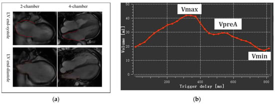 Left atrial volumetric analysis. (a) LA endocardium delineated on two-chamber and four-chamber views at LV end-systole and end-diastole; (b) A time-volume curve obtained by biplane area length method Vmax, maximal LA volume at LV end-systole; VpreA, LA volume at LV diastole before LA contraction; Vmin, minimal LA volume at LV end-diastole.