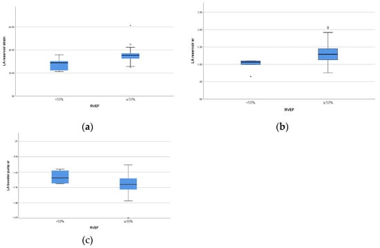 Box plots of left atrial function parameters with significant difference between different RV ejection fraction in the patients group. (a) LA reservoir strain; (b) LA reservoir strain rate; (c) LA pump strain rate.