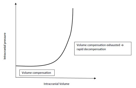 An increase in volume (e.g. tumour, hydrocephalus, abscess, bleeding) in either one of the intracranial compartments will result in an increased ICP and trigger compensatory mechanisms to reduce the volume of the remaining compartments. The extent, speed and duration of the physiological compensatory mechanisms is limited. Before cranial suture fusion, gradual decompression can additionally occur from an increase in skull size and can therefore mask classic symptoms of elevated ICP. Once intracranial compensation is exhausted (Figure 1), additional increases in intracranial volume result in a dramatic rise in ICP limiting cerebral blood flow (CBF) and calling for immediate intervention ([5], Figure 1).