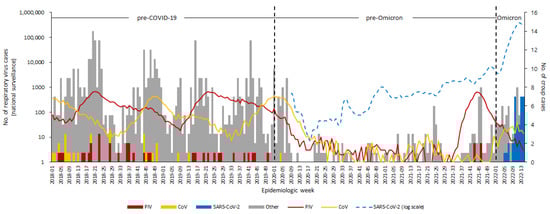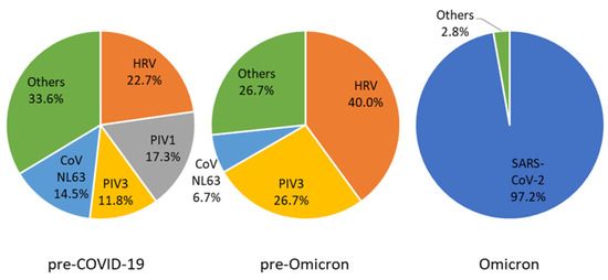 The viral identification rate was significantly higher in the Omicron period (56.3%, p < 0.001) than in the pre-COVID-19 (12.4%) and pre-Omicron (7.6%) periods. However, the proportion of patients going through mRT-PCR tests for respiratory viruses other than SARS-CoV-2 decreased from 14.0% (pre-COVID-19) to 1.5% (Omicron) throughout the study period (p = 0.001). The proportion of PCR tests for SARS-CoV-2 increased from 40.4% (pre-Omicron) to 84.4% (Omicron) (p < 0.001).