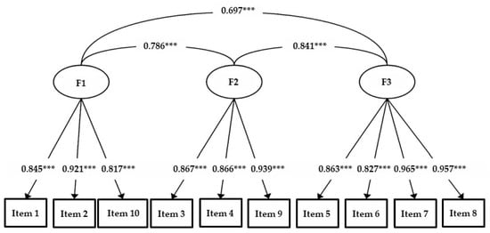 All three factorial structures showed an acceptable fit (see Table 1). Compared with the one-factor model, the two-factor model yielded a better fit, and the three-factor model fitted better than the two-factor model. For the three-factor model, the intercorrelations between the latent factors were high (see Figure 2). The loadings of the items on their respective latent factors were also high (>0.817).