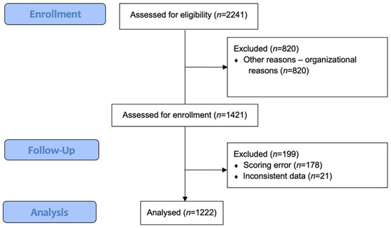 Overall, 2241 patients underwent general anesthesia for surgical or diagnostic procedures, were hospitalized at the PACU and were assessed for eligibility. For organizational reasons, 890 patients were not included, and 1421 patients were assessed for enrollment. A total of 1222 patients were included in the final statistical analysis. Out of these patients, 199 patients were excluded, due to a scoring error (n = 178) and inconsistent data (n = 21). Figure 1 illustrates the flowchart of patient enrolment. The demographics of the cohort are described in Table 1.