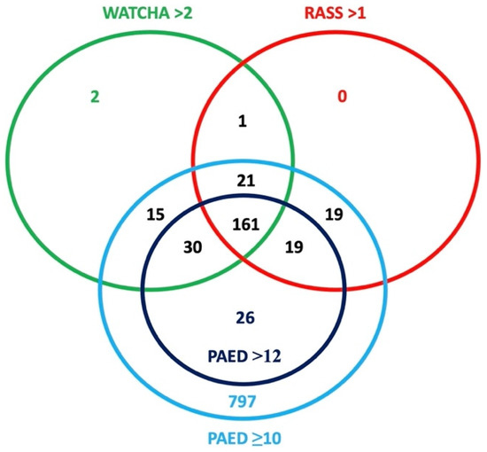 The results of the primary outcome (the incidence of emergence delirium) are shown in Table 2. The incidence of ED varied significantly depending on the scoring system used. The highest incidence of ED occurred when a PAED score with cutoff ≥10 points was used, where 89.0% (n = 1088) of patients were described as delirious. Out of these patients, 78.9% (n = 232) met the criteria in at least two scoring systems and 54.8% (n = 161) met the criteria in all three scoring systems (PAED > 12, RASS or Watcha). Only 21.1% (n = 62) patients were diagnosed by only one of these criteria (PAED > 12: n = 26, RASS: n = 19, Watcha: n = 17). These results are graphically illustrated in Figure 2.