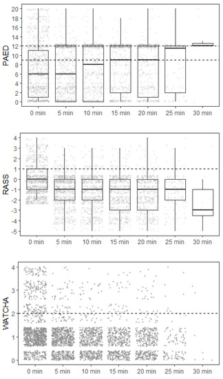 Paediatric Emergence Delirium (PAED) score, Watcha score and Richmond agitation and sedation scale (RASS) were measured at 0., 5., 10., 15., and 20. min after PACU admission. In case the RASS score upon admission was −3 or lower, the measurement began at the time at which the patient first made eye contact with the caregiver (obtaining RASS ≥ −2). Emergence delirium was defined as a PAED score greater than or equal to 10 points and/or a Watcha score over 2 and/or RASS over 1 minimally in one of the measurements.
