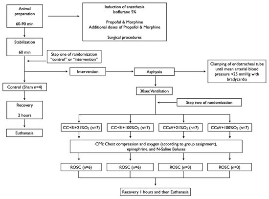 During infant CPR, combining CC with a sustained inflation (SI) (CC + SI) significantly reduced median (interquartile range (IQR)) time to ROSC with 248 (41–346) compared to CCaV with 720 (167–720) s (p = 0.0292) [11]. Similarly CC + SI significantly achieved ROSC faster compared to the 3:1 compression-to-ventilation ratio in asphyxiated neonatal piglets as well as newborn infants in the delivery room [12,13,14,15,16,17,18]. Furthermore, asphyxiated piglets randomized to either 21% or 100% O2 with 3:1 compression-to-ventilation ratio or CC + SI resulted in a similar time to ROSC [19,20]. Several animal trials examined various oxygen concentrations using adult and neonatal piglets [19,20,21,22,23], while pediatric studies are lacking [24]. Due to the lack of pediatric studies, we aimed to determine if 21% O2 using either CC + SI or CCaV will reduce time to ROSC compared to 100% O2 in infant piglets with asphyxia-induced cardiac arrest. We hypothesized that 21% O2 with either CC + SI or CCaV will reduce time to ROSC compared to 100% O2 in infant piglets requiring CPR after asphyxia-induced cardiac arrest. We also examined differences in hemodynamics and regional perfusion during recovery with different oxygen concentrations.