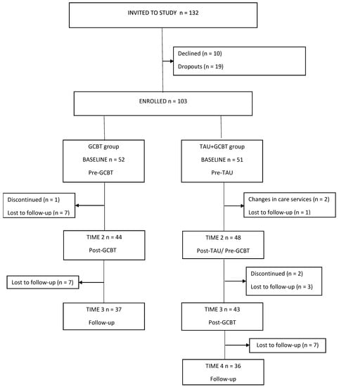 Following referral, children and their parents were asked to participate in the study. Of the 132 families invited to the study, a final sample of 103 children aged 6–12 years and their parents gave informed written consent for participation and use of measures, and were enrolled in the study. Further, informed written consent for the use of medical records in the collection of data on the children’s diagnoses, changes in medication, other ongoing treatments, schooling, and custody during the study was obtained for 94 children. Informed written consent for the use of medical records in the collection of data was not obtained for nine children. The flow diagram and study procedure are depicted in Figure 1 (see Section 2.5. Statistical Analysis Section for missing parent-/teacher-rated data at different time points). The baseline characteristics for participants are shown in Table 1. The present study is part of a larger treatment outcome study examining the effects of GCBT on the well-being of children with psychiatric disorders, approved by the HUS Ethics Committee for Women’s and Children’s Health and Psychiatry (49/13/03/03/2016 and HUS/2699/2018).