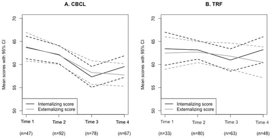 CBCL and TRF score changes over time from baseline to Time 2, Time 3, and to Time 4.
