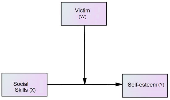 When analyzing the moderation models, we began by examining the magnitude of the relationships among the victim’s conditions, self-esteem, and social skill scores using zero-order correlations. For moderation analysis, we used Model 1 based on Hayes []; the antecedent variable (X) was social skills, the outcome variable (Y) was self-esteem, and the victim’s condition was considered a moderator (W) (Figure 1). Significant interaction (social skills scores by victim condition) was examined using visualizing predicted values of RSES within the presence or absence of victim conditions []. We used resampling or bootstrapping, and the product of coefficient strategies, as suggested by Preacher and Hayes, when conducting moderation analyses [,].