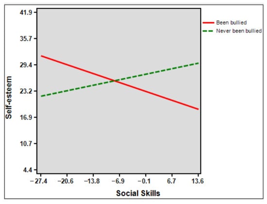 This study’s main hypothesis was to explore the bullying victim’s condition regarding the relationship between social skills and self-esteem. The findings confirmed that the association between the level of social skills and the level of self-esteem depends on the bullying victim’s condition. For example, the relationship was expectedly positive among adolescents who had never been bullied. In contrast, the relationship between social skills and self-esteem was insignificant among students who had been bullied. Bullying victims’ conditions appear to be the third variable influencing the relationship because moderating effects between bullying victims’ conditions and social skills are significant. These results highlight the effect of the victimization experience on self-esteem through, in this case, social skills. The psychological effect of the victimization experience may persist even though the penetrations have ended []. In fact, social skills are merely one example involved in bullying victimization and self-esteem. Other promoting behaviors or skills might be observed in self-esteem along the same line as social skills. Therefore, it would be essential not to allow bullying victimization to go “undetected”.