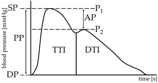 Central pulse curve. SP—systolic blood pressure, DP—diastolic blood pressure, PP—pulse pressure, P1—pressure at the peak systolic (forward) pulse wave, P2—pressure at the peak of reflected (backward) pulse wave, AP—augmentation pressure, TTI—tension time index, DTI—diastolic time index.