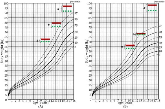 Body weight (BWT) in measurements I. and II. for males (A) and females (B). Solid red line represents measurement I., which was made at the beginning of the one-month stay in the children’s hospital, dashed green line represents measurement II., made at the end of the one-month stay in the children’s hospital. *—p value is less than 0.01; Δ—p value is less than 0.05; p value—statistical evaluation of the differences between the measurements I. and II., Wilcoxon signed-rank test (paired test).