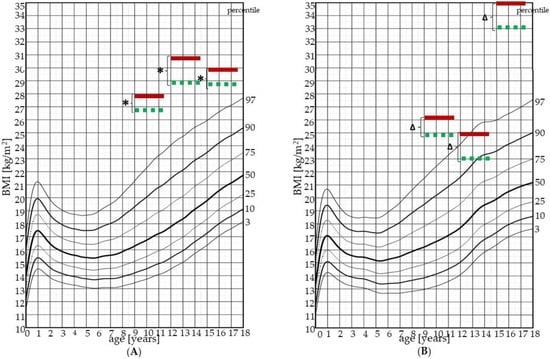 Body mass index (BMI) in measurements I. and II. for males (A) and females (B). Solid red line represents measurement I., made at the beginning of the one-month stay in the children’s hospital, dashed green line represents measurement II., made at the end of the one-month stay in the children’s hospital. *—p value is less than 0.01; Δ—p value is less than 0.05; p value—statistical evaluation of the differences between the measurements I. and II., Wilcoxon signed-rank test (paired test).