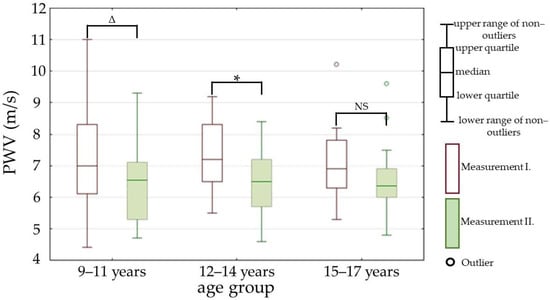 Pulse wave velocity (PWV) in measurements I. and II. Measurement I.—at the beginning of the one-month stay in the children’s hospital; measurement II.—at the end of the one-month stay in the children’s hospital; *—p value is less than 0.01; Δ—p value is less than 0.05; NS—non-significant; p value—statistical evaluation of the differences between the measurements I. and II., Wilcoxon signed-rank test (paired test).