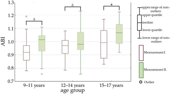 Ankle-brachial index (ABI) in measurements I. and II. Measurement I.—at the beginning of the one-month stay in the children’s hospital; measurement II.—at the end of the one-month stay in the children’s hospital; *—p value is less than 0.01; Δ—p value is less than 0.05; p value—statistical evaluation of the differences between the measurements I. and II., Wilcoxon signed-rank test (paired test).
