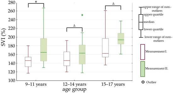 Subendocardial viability index (SVI) in measurements I. and II. Measurement I.—at the beginning of the one-month stay in the children’s hospital; measurement II.—at the end of the one-month stay in the children’s hospital; *—p value is less than 0.01; Δ—p value is less than 0.05; p value—statistical evaluation of the differences between the measurements I. and II., Wilcoxon signed-rank test (paired test).