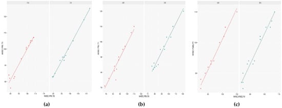 Both the assumptions of homogeneity of regression slopes and covariate-treatment independence were tenable in all covariate models. The interaction term was not considered in the ANCOVA models’ fitting because ANOVA has shown that this term does not bring significant information to the covariate models. As visible in Table 2 and Figure 1a–c, after controlling for the effect of the scores at baseline, we found that the type of treatment affected the WISC domains of PRI (t = 2.809; p < 0.01), PSI (t = 3.352; p < 0.01), and FSIQ (t = 3.071; p < 0.01), increasing the scores of these tests in the experimental group significantly.